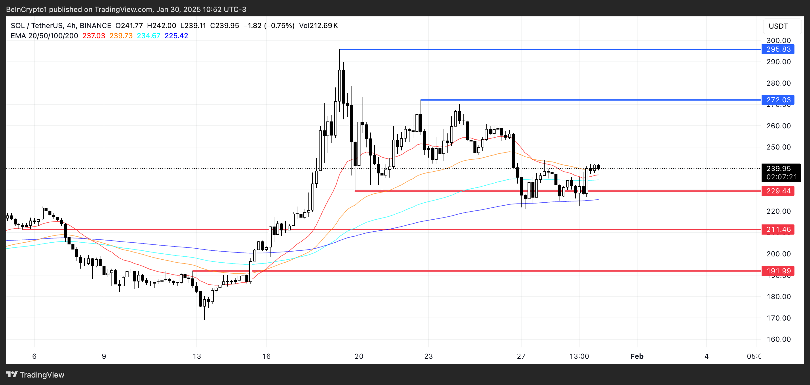 Cena Solana konsoliduje się między 225 USD a 239 USD w ciągu ostatnich kilku dni, bez wyraźnego trendu. Jej linie EMA pozostają ściśle zgrupowane, co wskazuje na niezdecydowanie, ale wkrótce może się tworzyć złoty krzyż.