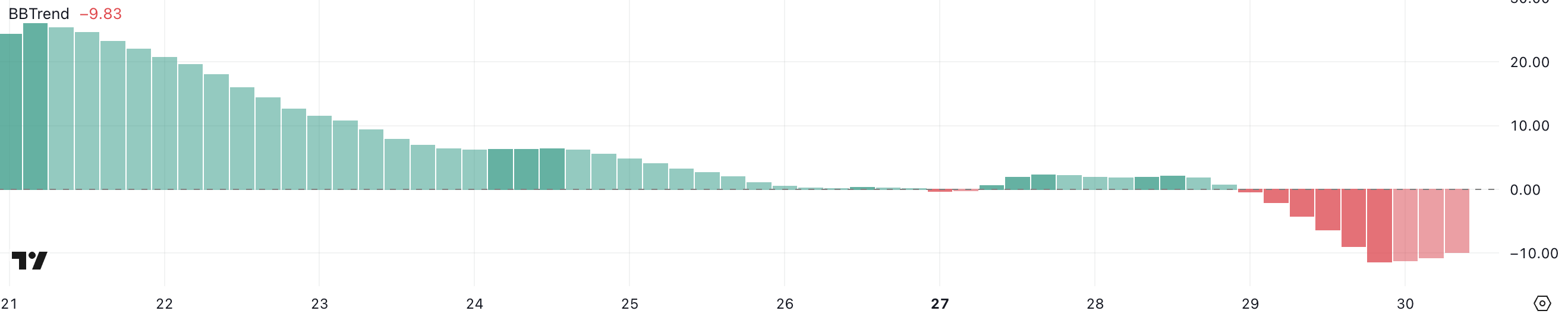 Kiedy BBTrend jest pozytywny, sugeruje byczy impet, ponieważ ceny zwykle pozostają blisko górnej wstęgi. Natomiast negatywny BBTrend wskazuje na niedźwiedzi impet, gdzie ceny zbliżają się do dolnej wstęgi. Większe wartości bezwzględne sugerują silniejsze trendy, podczas gdy wartości bliskie zeru oznaczają brak siły kierunkowej.
