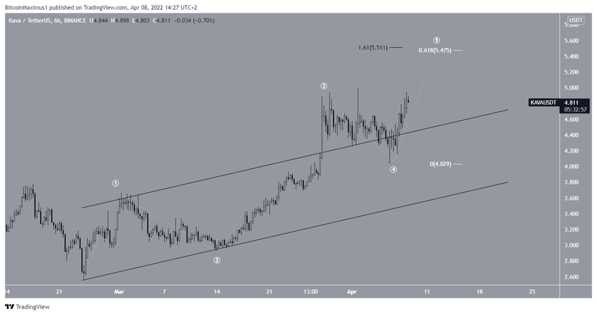 Liczba fal sugeruje, że KAVA rozpoczął pięciofalowy ruch w górę (biały) 23 lutego. Jeśli to prawda, jest to obecnie piąta i ostatnia fala tego ruchu w górę.
