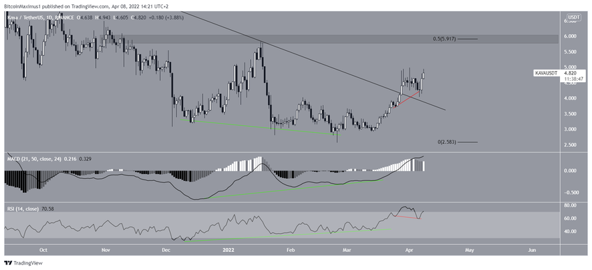 Kava.io (KAVA) wyłamało się z długoterminowej linii opadającej linii oporu. Przyspieszył tempo wzrostu po zwyżkowych odczytach wskaźników technicznych.