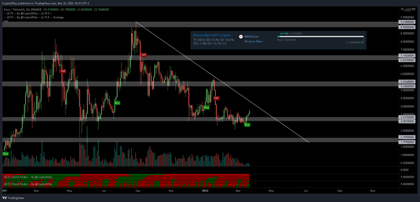 Trader kryptowalut @CryptoNTez zamieścił na Twitterze wykres KAVA, stwierdzając, że cena może wybić się z długoterminowej linii opadającej linii oporu.