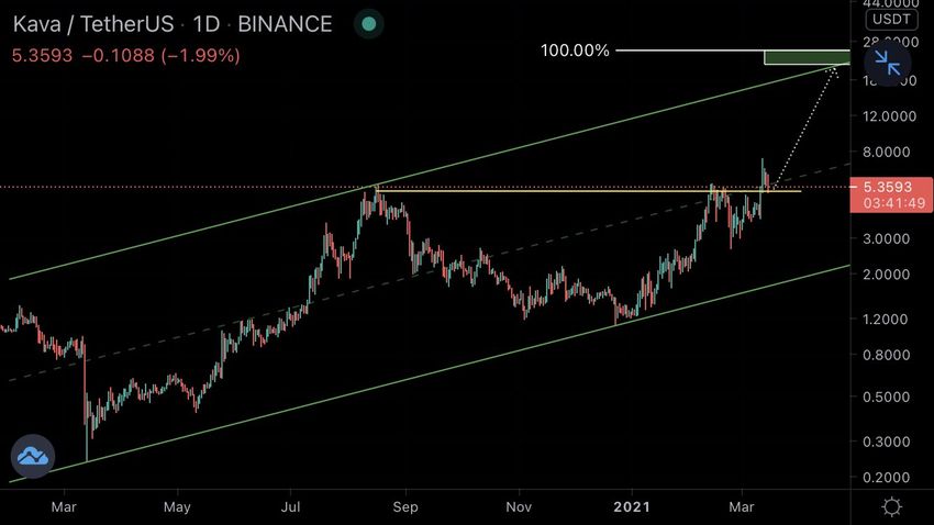 Kryptowalutowy trader @Mesawine1 przedstawił wykres KAVA, stwierdzając, że cena może wzrosnąć do 25 USD w ciągu kilku miesięcy.