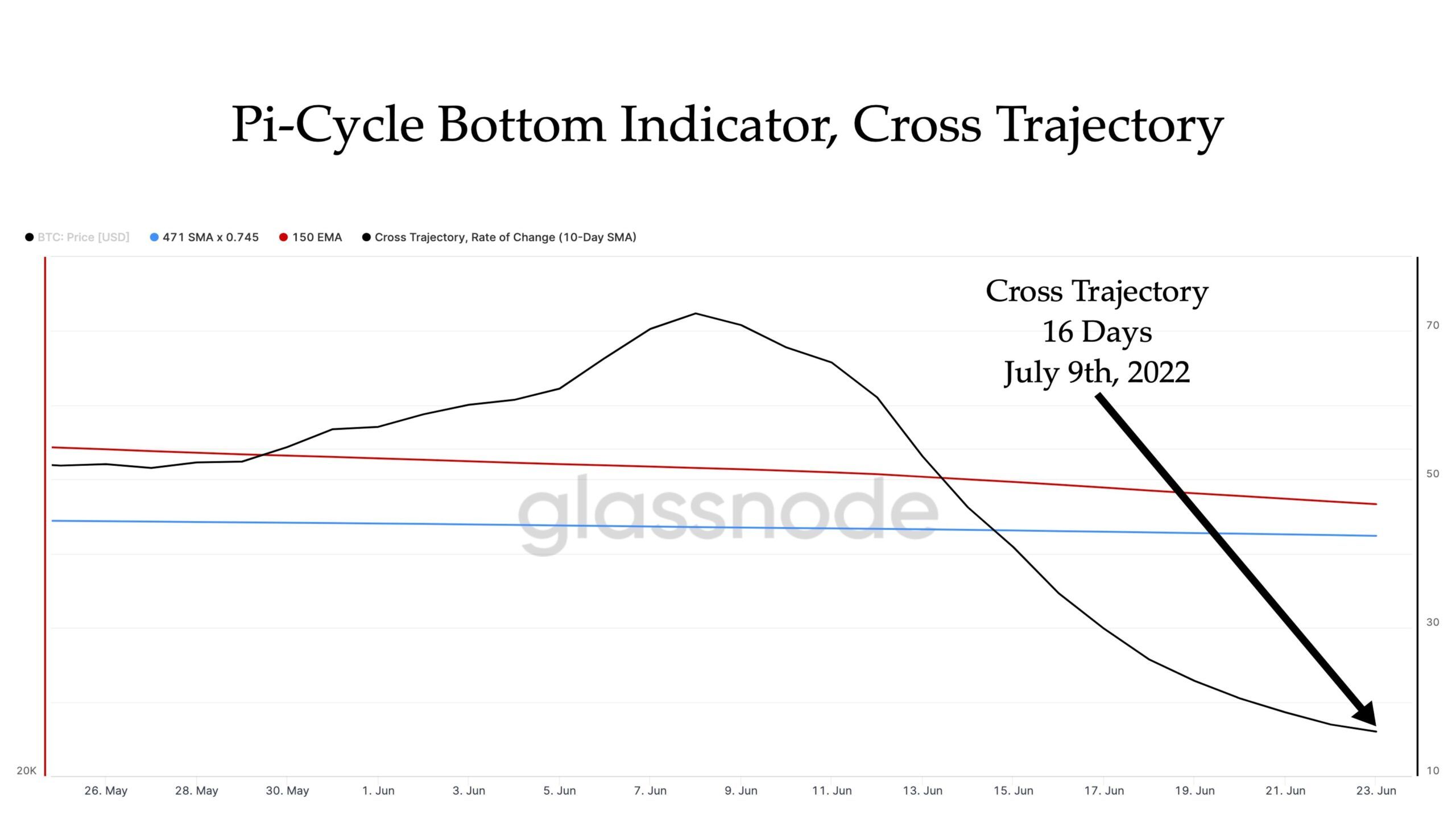 Analityk rynku kryptowalut @TheRealPlanC zamieścił na Twitterze własną prognozę daty przecięcia i osiągnięcia hipotetycznego dna Bitcoina. Na podstawie trajektorii ruchu dwóch krzywych oszacował, że przecięcie nastąpi w dniu 9-go lipca 2022 roku.