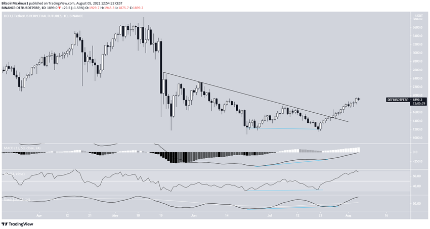W dniach 22 czerwca i 20 lipca indeks DeFi utworzył formację podwójnego dna. Formacja ta była połączona z byczymi dywergencjami na oscylatorach MACD, RSI i stochastycznym.