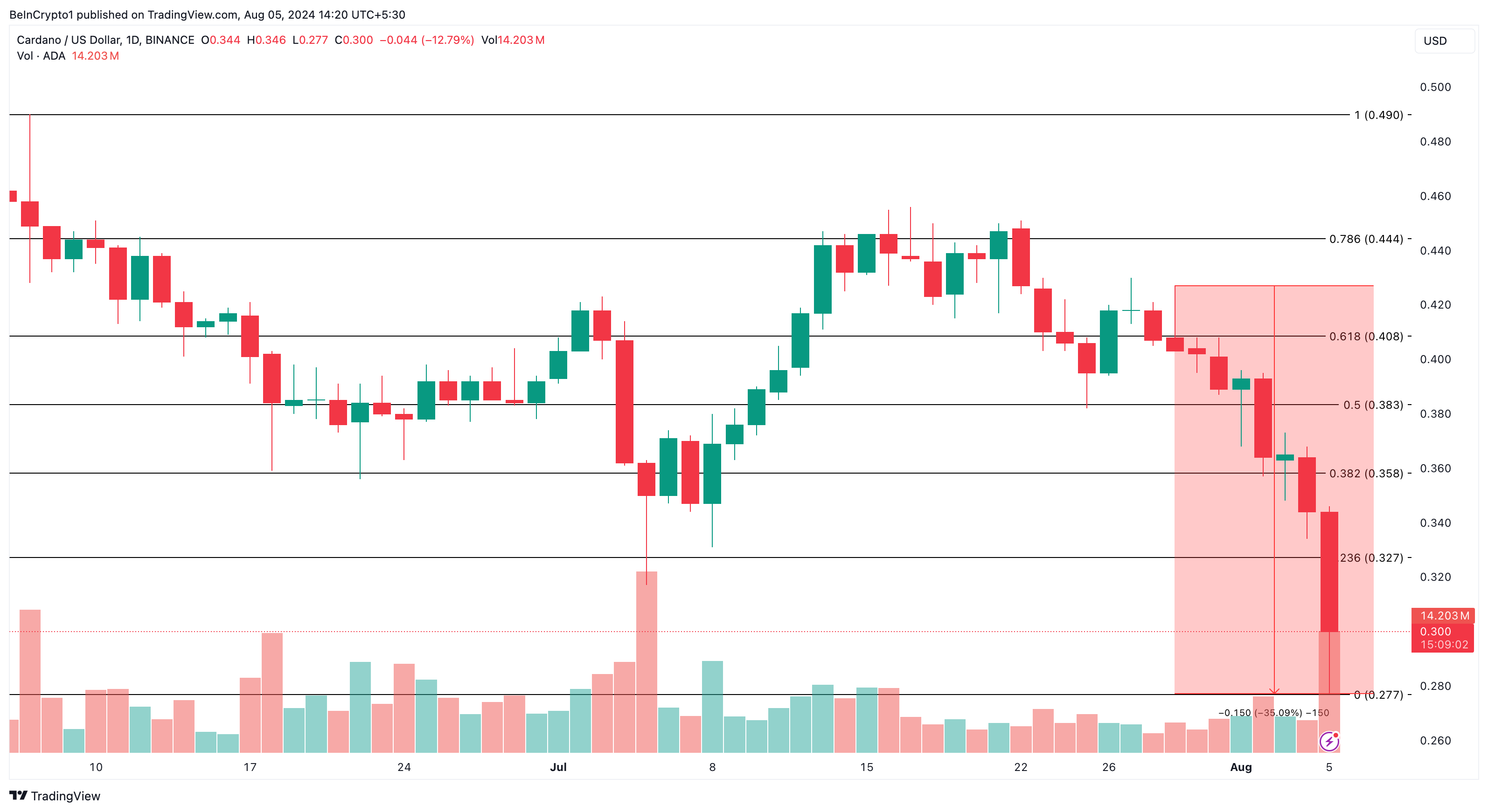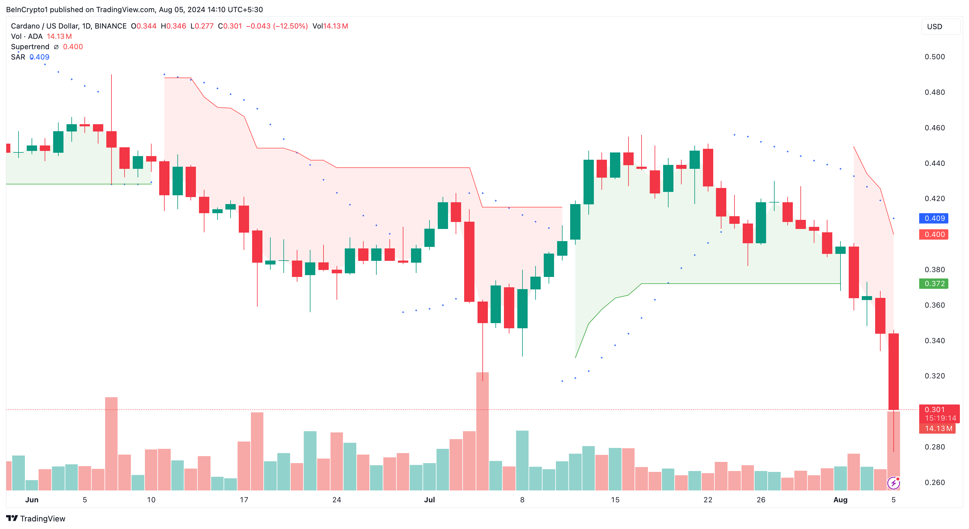 Od 2 sierpnia na wykresie dziennym Cardano pojawiło się wiele sygnałów sprzedaży, co jest jednym z powodów przyspieszonego spadku wartości tokena.