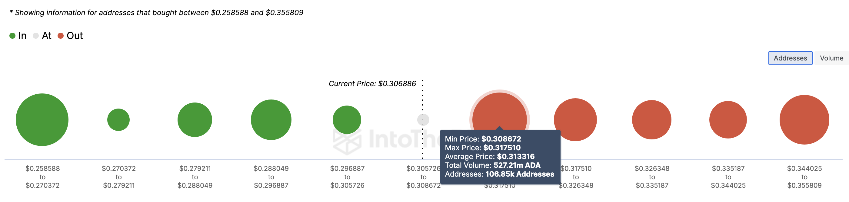 Według IntoTheBlock całkowita liczba adresów z zyskami, które kupiły ADA między 0,28 USD a 0,30 USD, nie dorównuje adresom ponoszącym straty przy 0,31 USD.