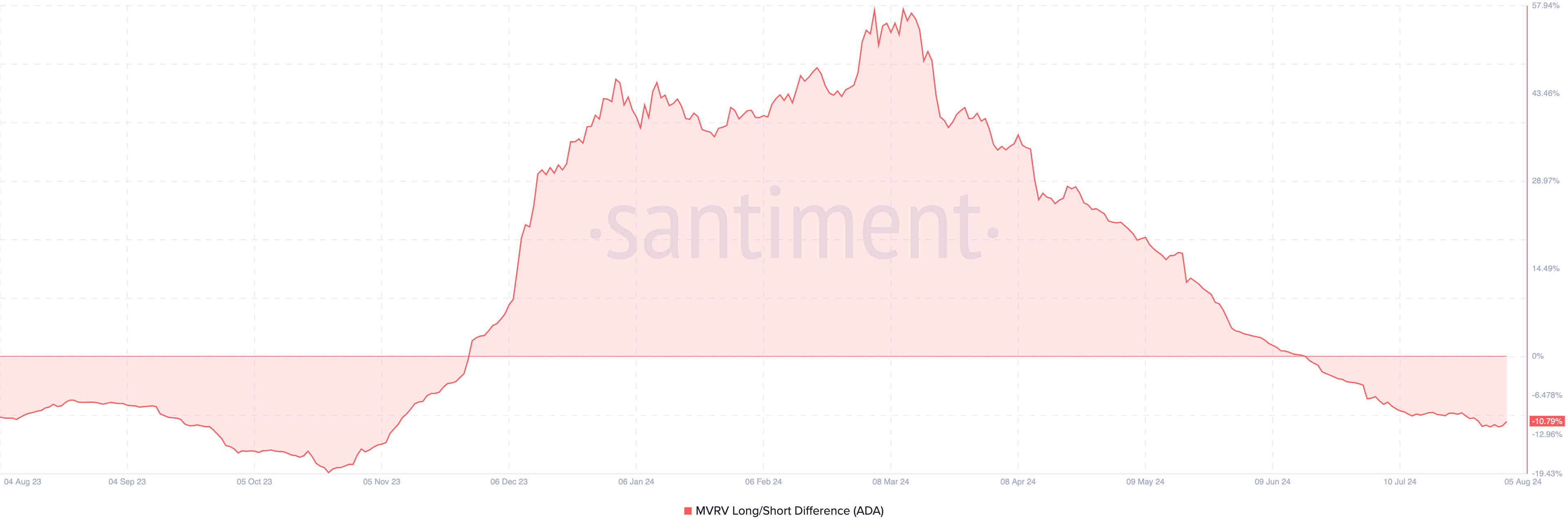 Gdy odczyt jest dodatni, oznacza to, że długoterminowi posiadacze realizują większe zyski. Jednak w przypadku ADA jest odwrotnie.