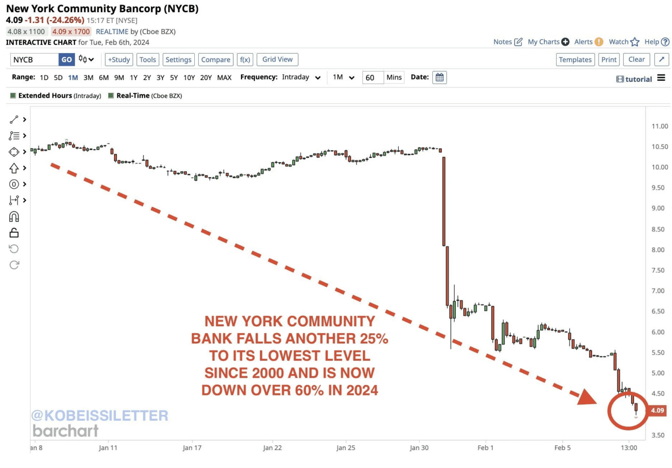Akcje NYCB gwałtownie spadły po nieoczekiwanej stracie w wysokości 260 mln USD w czwartym kwartale 2023 r. Obecnie znajdują się na najniższym poziomie od czerwca 2000 roku. Wzbudziło to obawy o średniej wielkości banki regionalne narażone na nieruchomości komercyjne. Ponadto 6 lutego agencja ratingowa Moody’s obniżyła rating kredytowy NYCB do statusu śmieciowego.