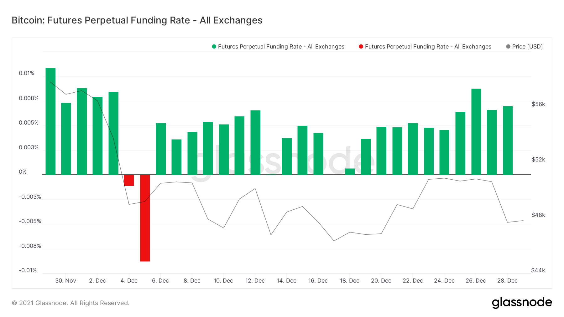 Stopa finansowania bezterminowych kontraktów futures jest kolejnym, interesującym wyznacznikiem kondycji rynku. Gdy jest ona dodatnia, to posiadacze pozycji długich okresowo płacą niewielką kwotę posiadaczom pozycji krótkich. I odwrotnie, kiedy stopa jest ujemna, krótkie pozycje okresowo płacą długim pozycjom.