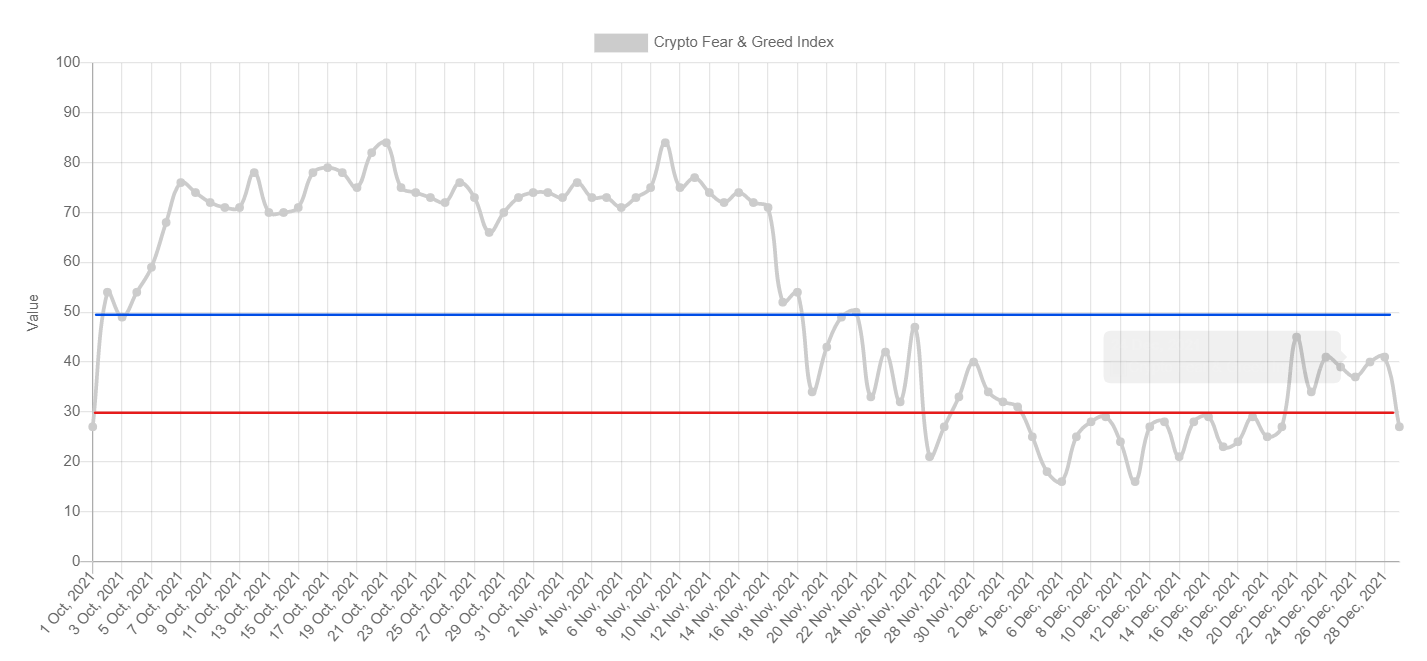 Ostatnie wybicie ceny Bitcoina powyżej opadającej linii oporu i odzyskane obszaru 50 000 USD w dniu 23 grudnia poskutkowało wzrostem wskaźnika w okolice 40. Jednak wczorajszy spadek o ponad 6% ponownie wprowadził strach na rynek, a Fear and Greed Index pokazuje dziś 27.
