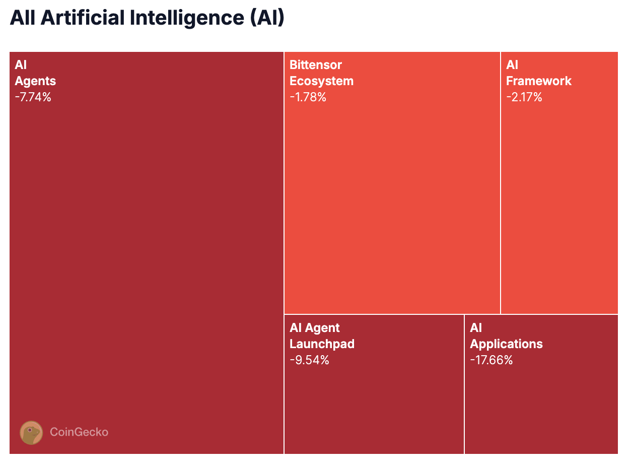 Tymczasem inne dotknięte sektory to AI Agent Launchpad, który odnotował spadek o 9,5%, oraz AI Agents, który spadł o 7,7%. Ponadto sektor AI Framework spadł o 2,1%. Z kolei ekosystem Bittensor również odnotował spadek, choć mniejszy, wynoszący 1,7%.