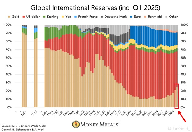 „Kończymy tym wykresem: Nagły wzrost złota jako % globalnych rezerw, podczas gdy % USD spada.”