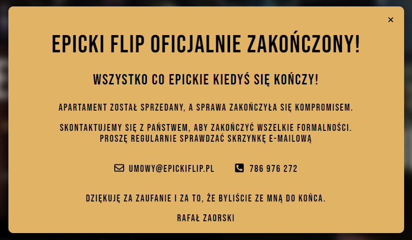 W piątek rano na mediach społecznościowych Rafała Zaorskiego pojawiła się informacja o oficjalnym zakończeniu projektu “Epicki Flip”, który wywołał wiele kontrowersji wśród społeczności kryptowalut, deweloperów, a nawet wśród warszawskiej elity mieszkającej w wieżowcu Złota 44. Spekulant sprzedał apartament na Złotej 44, a na stronie epickiflip.pl możemy przeczytać taką informację.