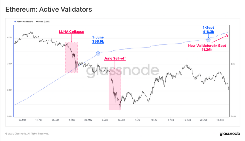 Ostatnie dane Glassnode pokazały, że ponad 11,36 tys. walidatorów pojawiło się w sieci tylko we wrześniu. To oznacza rosnące zaufanie inwestorów jako techniczne wyzwania związane z eliminacją ryzyka Merge.