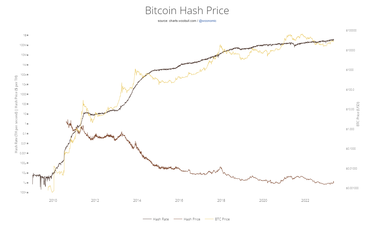 Generalnie prowadzi to do systematycznego spadku dochodu górników. Jeden z najbardziej znanych analityków on-chain @woonomic wyraża tę tendencję za pomocą wskaźnika hash price. Jest to przychód generowany przez górników w przeliczeniu na terahashe.
