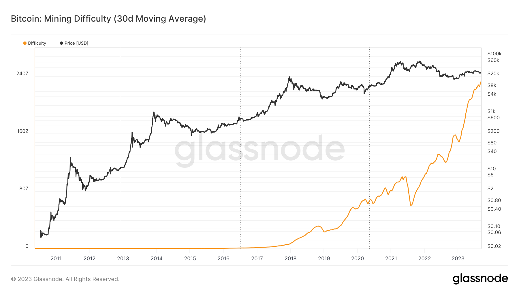Dla osób rozumiejących sposób działania sieci Bitcoin oczywiste jest, że wraz ze wzrostem mocy obliczeniowej mierzonej przez hash rate, wzrasta też trudność wydobycia BTC. Wykres tego wskaźnika jest prawie identyczny od hash rate i dziś też odnotowuje swoje ATH.