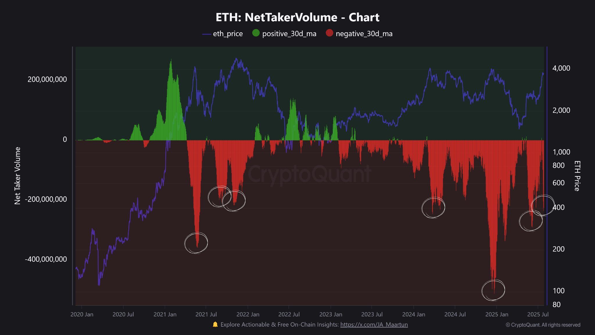 Kolejnym sygnałem ostrzegawczym dla potencjalnej korekty Ethereum w sierpniu jest wskaźnik Net Taker Volume. Pokazał on negatywną wartość 231 mln USD pod koniec lipca. Oznacza to, że zlecenia sprzedaży znacznie przewyższyły zlecenia kupna, według analityka Maartunna.