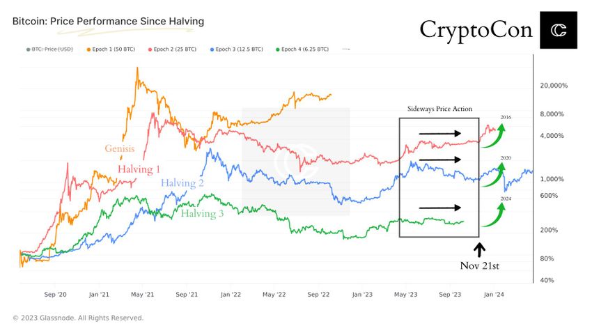 Ostatnie dwa miały podobne sześciomiesięczne okresy handlu bocznego prowadzące do końca roku. W 2023 r. rynki kryptowalut pozostawały w trendzie bocznym przez ostatnie siedem miesięcy.