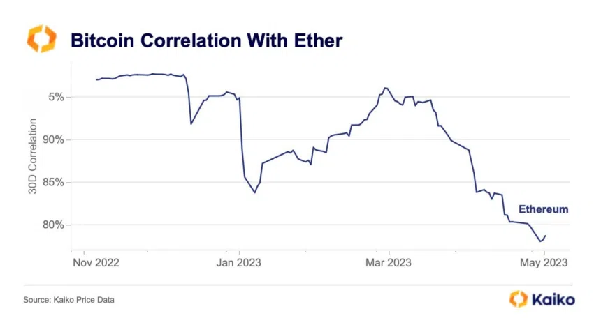 30-dniowa korelacja ruchoma między Bitcoinem (BTC) i Ethereum (ETH) spadła poniżej 80% po raz pierwszy od listopada 2021 roku, według platformy analitycznej Kaiko. Wskazuje to, że dwie największe kryptowaluty pod względem kapitalizacji rynkowej stają się mniej zależne od siebie, a ich ceny coraz częściej poruszają się w różnych kierunkach.