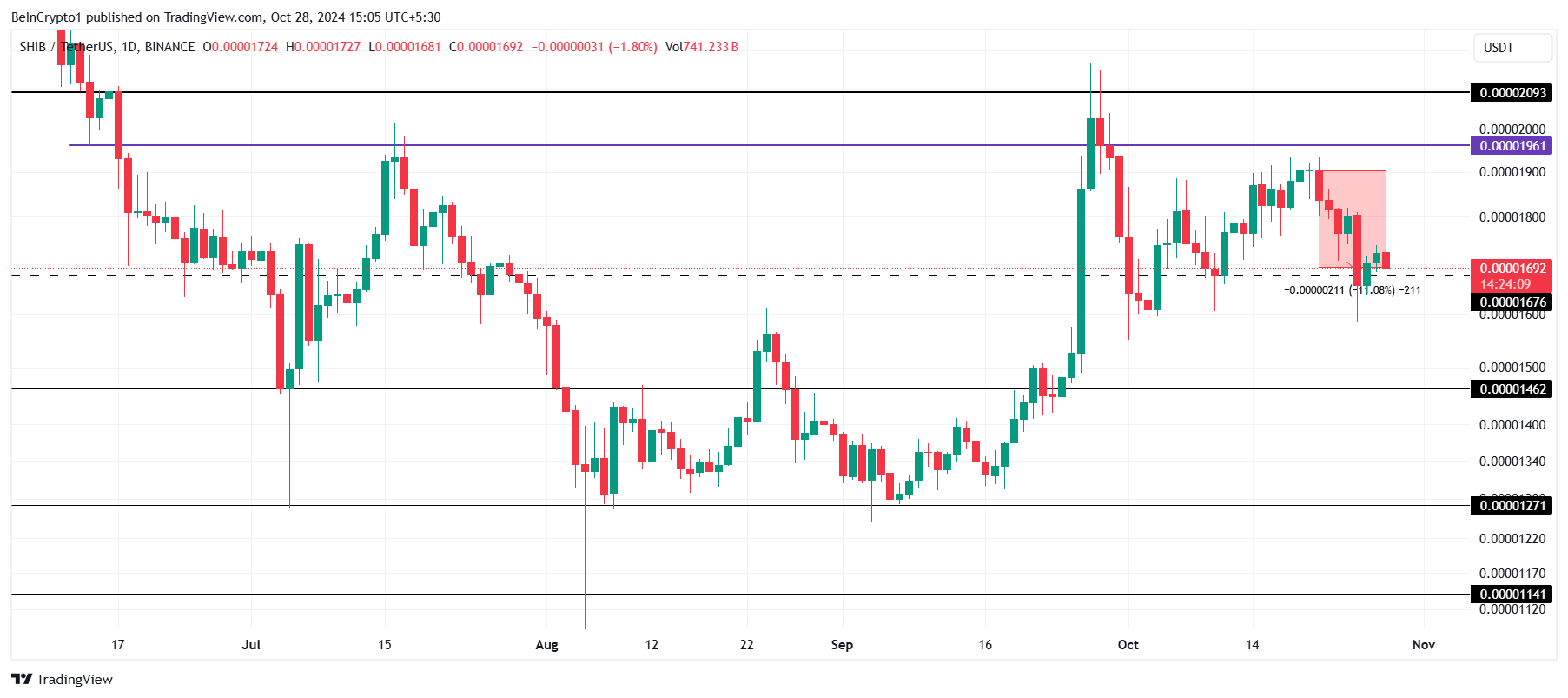 Cena Shiba Inu spadła o 11% w tym tygodniu, ale pozostaje powyżej lokalnego poziomu wsparcia 0,00001676 USD. Niezdolność memecoina do pokonania poziomów oporu na 0,00001961 USD i 0,00002093 USD ograniczyła potencjalne zyski. Bez przełamania tych barier SHIB może nadal mieć trudności z uzyskaniem wzrostowego impetu, co ogranicza krótkoterminowe zyski.
