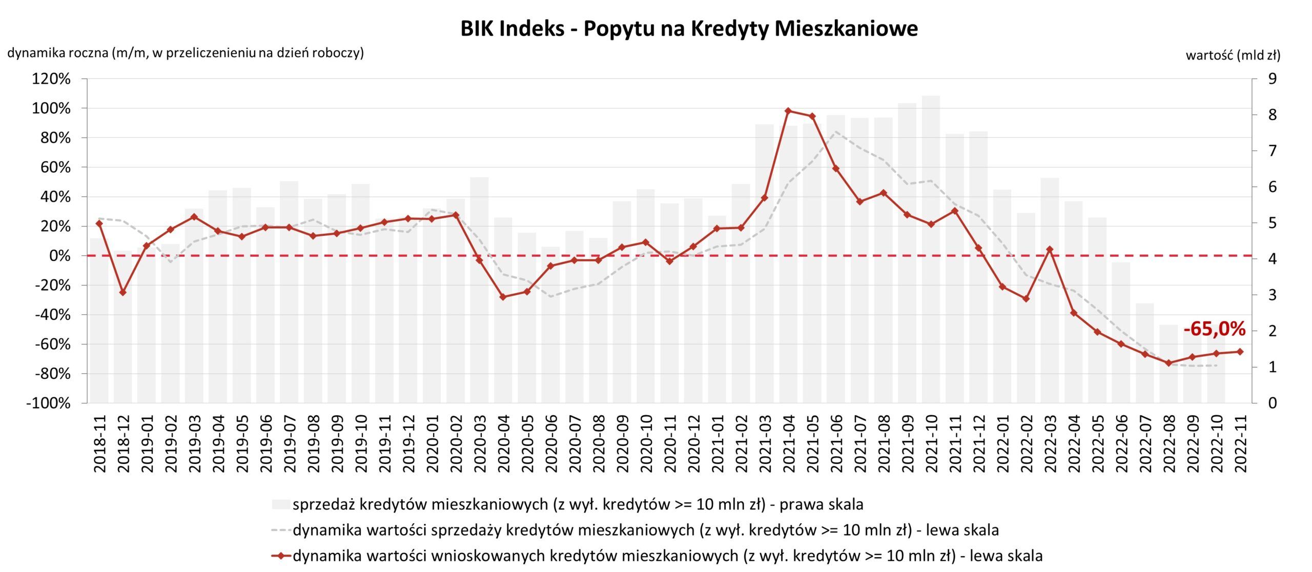 Biuro Informacji Kredytowej udostępniło najnowsze dane dotyczące popytu na kredyty mieszkaniowe. Liczba wnioskujących o kredyty hipoteczne spadła w listopadzie o 63 proc. rok do roku. Jeszcze większy, bo 65 proc. spadek odnotowano dla wartości zapytań kredytowych. Biorąc pod uwagę komunikat prasowy RPP, sytuacja prawdopodobnie nie poprawi się znacznie w najbliższym okresie.