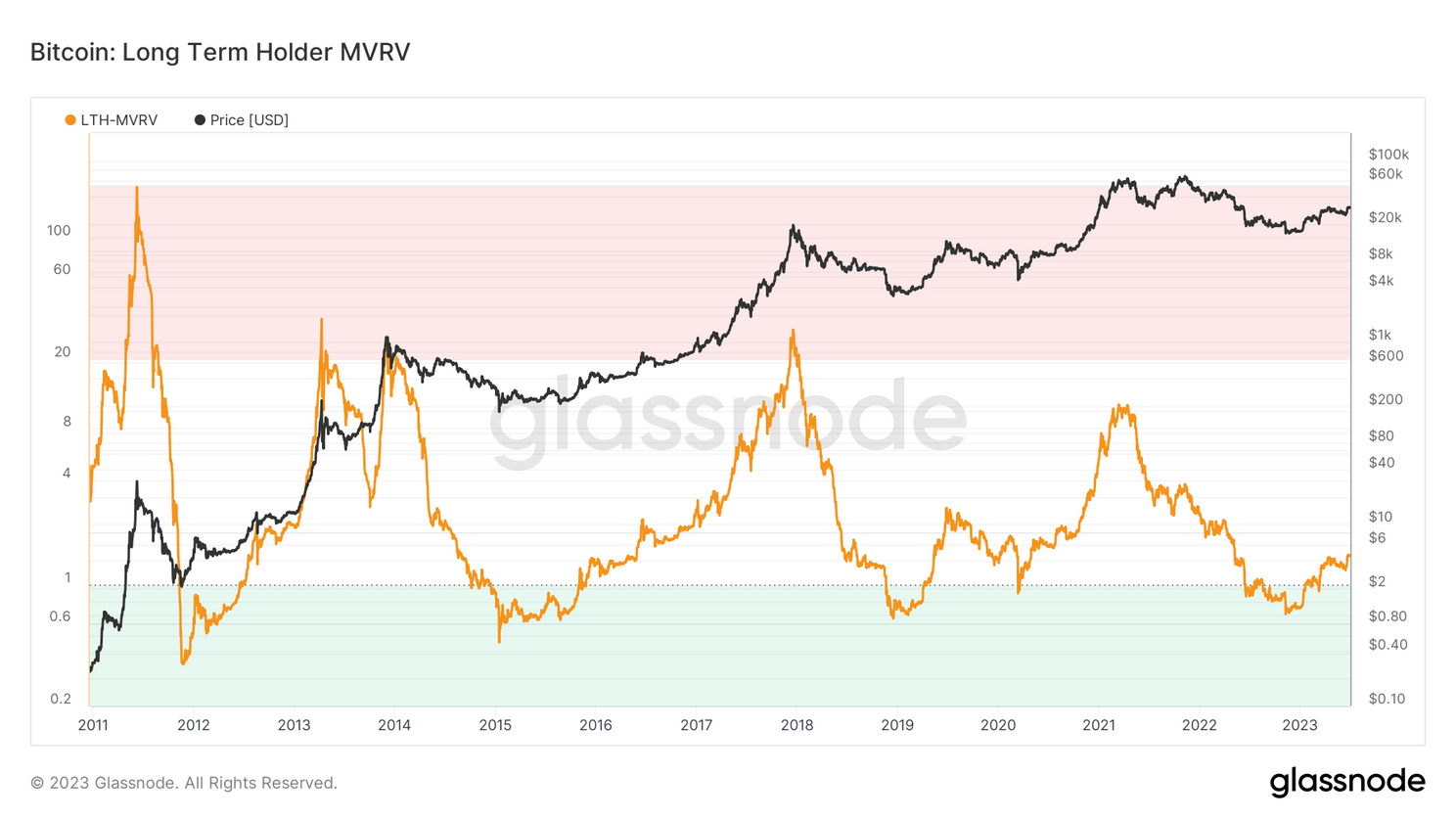 Wskaźnik LTH-MVRV Glassnode, odzwierciedla rentowność monet trzymanych przez 155 dni lub dłużej. Pokazuje on obecnie, że przeciętny inwestor LTH osiąga 47% zysku na swojej pozycji.