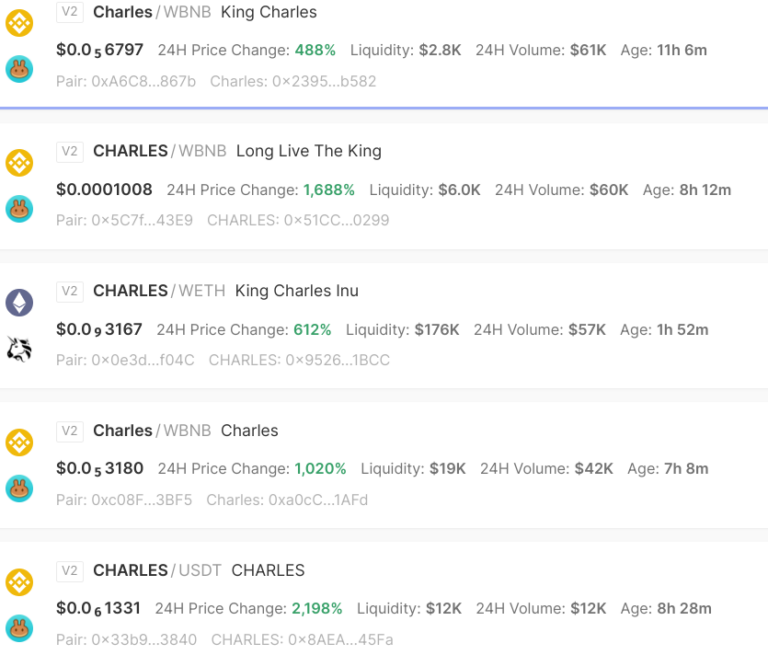 Pojawiły się także inne tokeny nazwane imieniem nowego monarchy, króla Karola III. Według DexScreener, w ciągu ostatniej doby powstało co najmniej 40 różnych tokenów meme. Oto kilka przykładów: