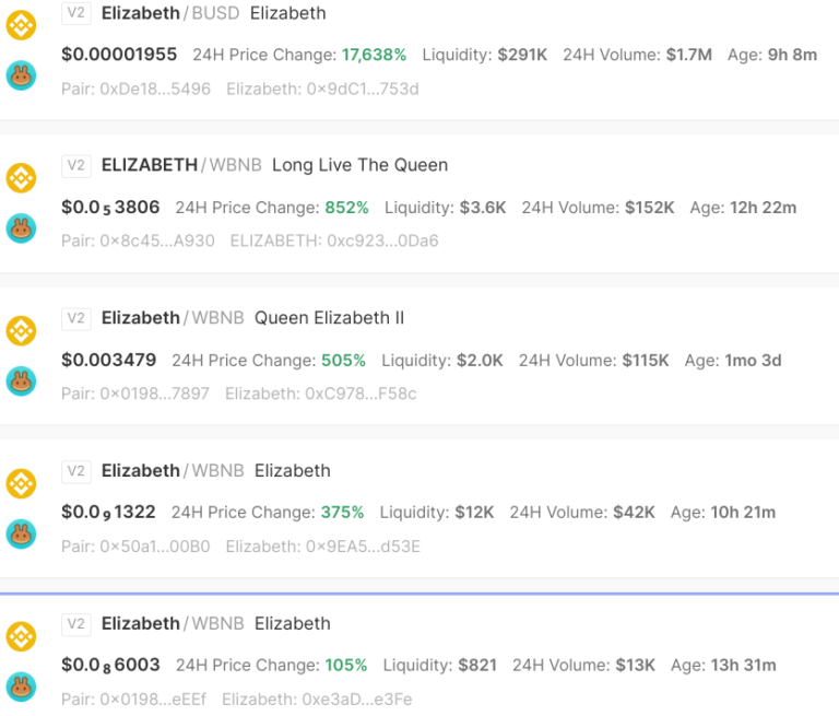 Moneta Elizabeth od momentu premiery wzrosła o 18 000%, a jej wolumen obrotu wynosi 1,7 mln. Inne płynne tokeny, takie jak Save The Queen i Queen Elizabeth Inu, przetworzyły odpowiednio prawie 900 000 i 200 000 USD wolumenu obrotu.