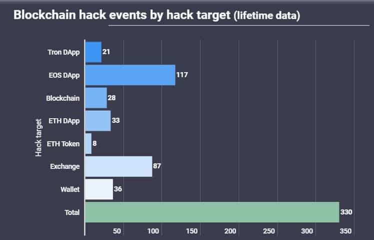 W dokumencie zaznaczono, że ponad 35% wszystkich ataków dot. zdecentralizowanych aplikacji (dApps) działających na blockchainie EOS. Następne w kolejności są giełdy kryptowalut, których bezpieczeństwo zostało naruszone 87 razy.