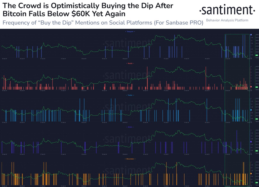 SponsoredPomimo tych dużych sprzedaży, reakcja inwestorów detalicznych była szczególnie optymistyczna. Według danych Santiment, platformy do analizy zachowań, sektor detaliczny agresywnie kupuje Bitcoina poniżej poziomu 60 000 USD. Santiment wyjaśnia: