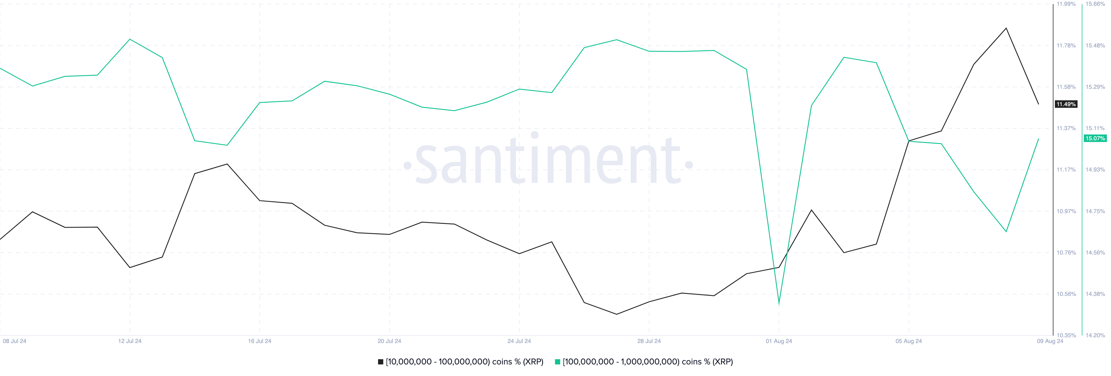 Krypto wieloryby zgromadziły dużo XRP, co spowodowało wzrost kapitalizacji rynkowej o 23% w ciągu jednego dnia: 7 sierpnia. Przed ostatnim spadkiem, portfele posiadające od 1 mln do 10 mln XRP miały tokeny o wartości 4,42 mld USD. Ta wartość odpowiadała 7,06 mld XRP.