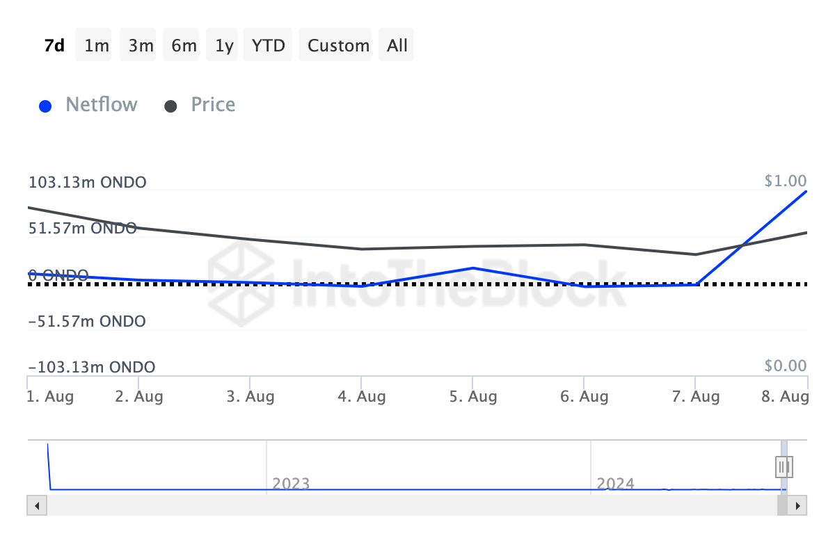 Ondo ponownie znalazło się na liście altcoinów kupowanych przez krypto wieloryby, tak jak w ostatnim tygodniu lipca. Dane z IntoTheBlock pokazują, że w ciągu siedmiu dni napływy z portfeli dużych posiadaczy wzrosły o ponad 3000%.