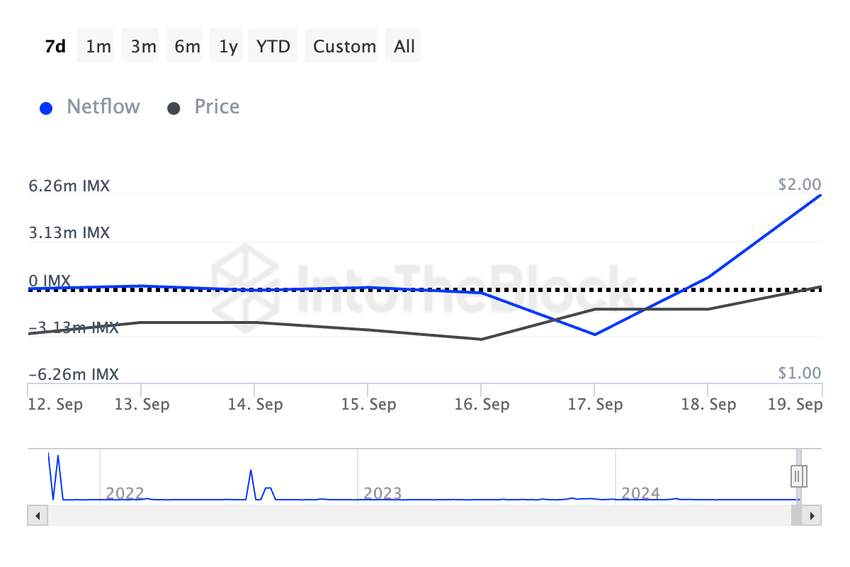 Wzrost przepływu netto dużych posiadaczy — różnica między kupowanymi a sprzedawanymi monetami — sygnalizuje akumulację. To często wskazuje na optymistyczną perspektywę ceny aktywa. W rezultacie wartość IMX wzrosła o 29% w ciągu ostatniego tygodnia.