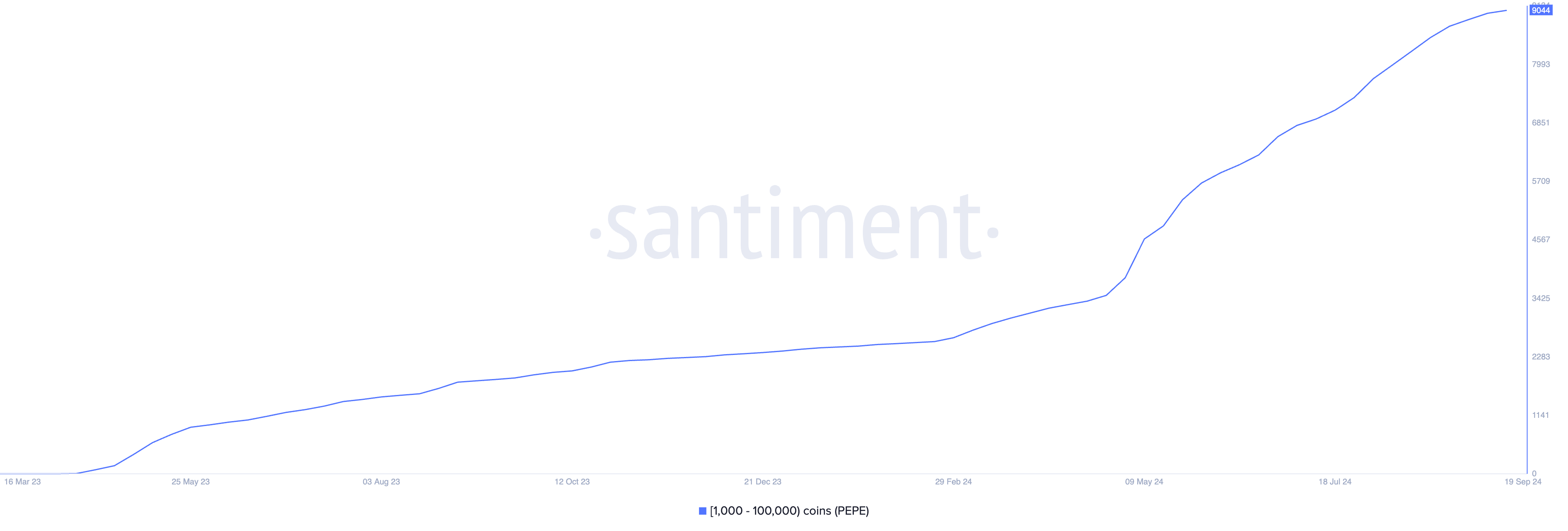 Według Santiment krypto wieloryby wśród posiadaczy PEPE wzrosły do 9044 w ciągu ostatnich siedmiu dni. Jest to najwyższy poziom od czasu wprowadzenia na rynek tej kryptowaluty.