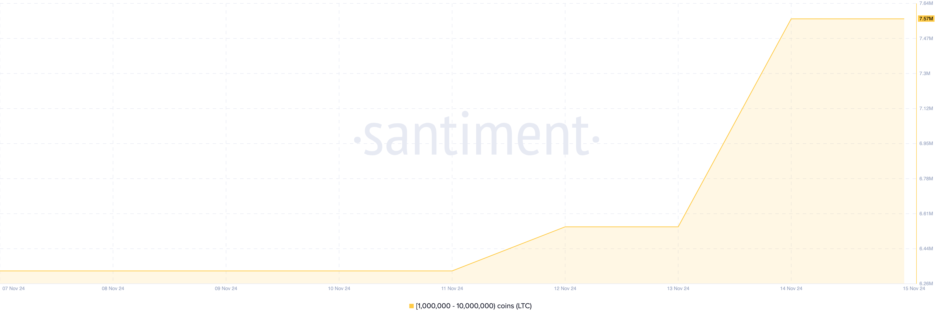 SponsoredObecnie liczba ta wzrosła do 7,57 mln, co wskazuje, że krypto wieloryby kupują LTC o wartości około 106 mln USD w drugim tygodniu listopada 2024 roku. Podobnie jak w przypadku DOGE, akumulacja ta wpłynęła również na wartość altcoina.