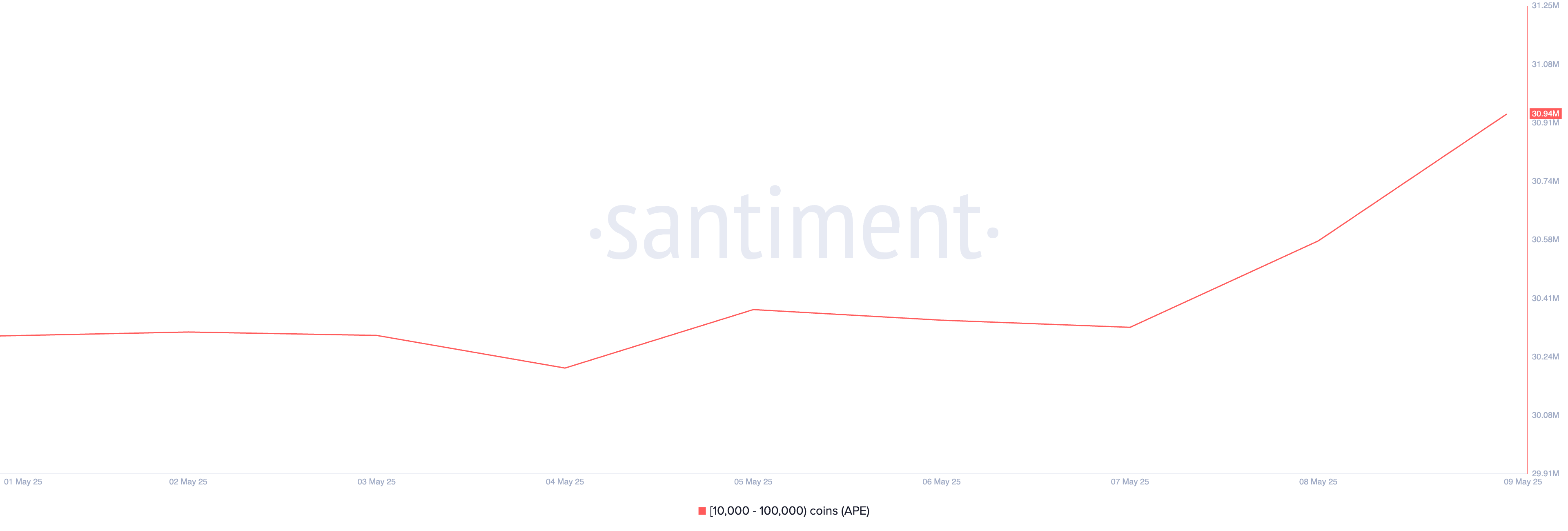 Ta grupa inwestorów APE obecnie posiada 30,94 mln tokenów, co jest najwyższym poziomem odnotowanym od listopada 2022 roku. Wzrost posiadanych tokenów podkreśla odnowione zaufanie i rosnące zainteresowanie APE, sygnalizując, że główni inwestorzy pozycjonują się na potencjalne wzrosty.