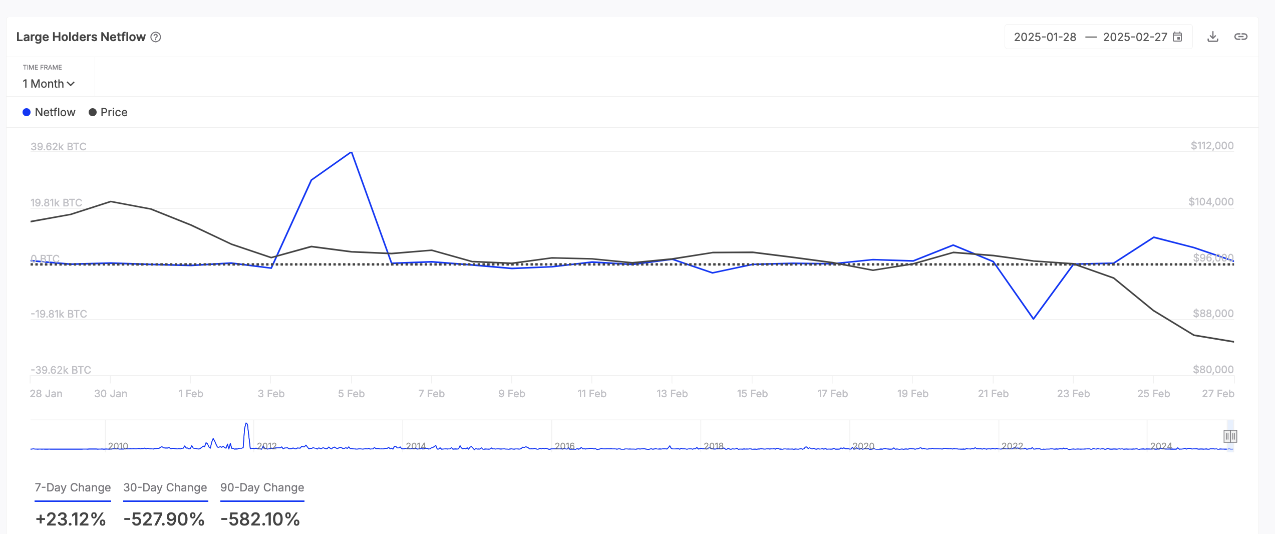Duzi posiadacze to adresy wielorybów, które posiadają ponad 0,1% podaży krążącej danego aktywa. Ich przepływ netto śledzi różnicę między wpływami a odpływami aktywa posiadanego przez tych głównych inwestorów.