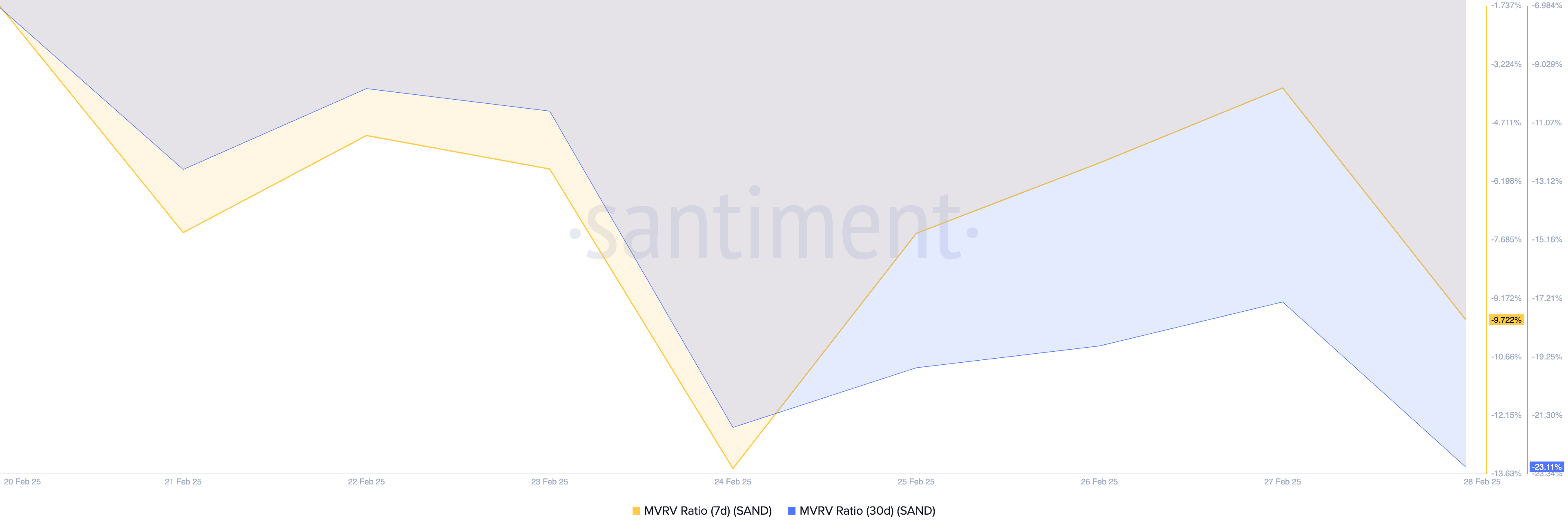 Wzrost posiadania SAND przez krypto wieloryby wynika z jego obecnego niedowartościowania, co odzwierciedlają odczyty z jego wskaźnika wartości rynkowej do wartości zrealizowanej (MVRV). W momencie pisania, 7-dniowe i 30-dniowe wskaźniki MVRV dla altcoina wynoszą odpowiednio -9,72 i -23,11.