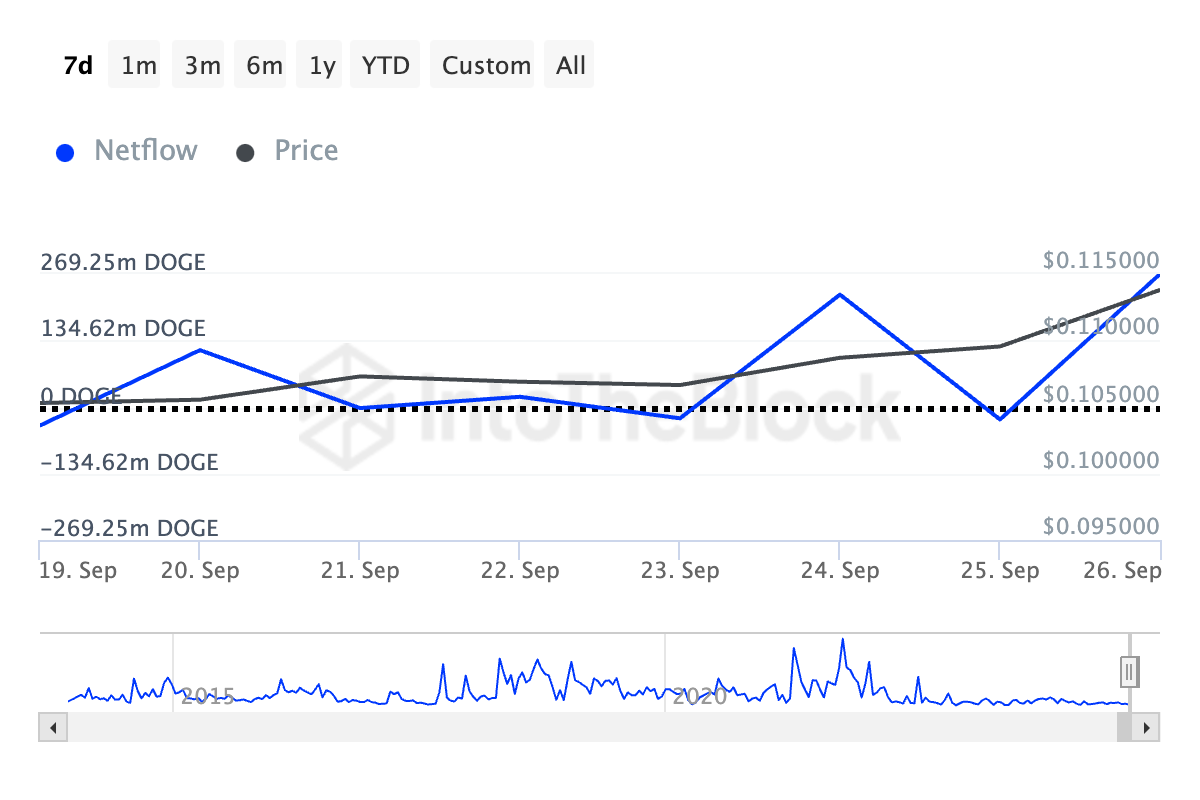 Aktywność wielorybów DOGE, śledzona przez przepływ netto jego dużych posiadaczy, ujawnia, że inwestorzy posiadający więcej niż 0,1% obiegowej podaży monety zwiększali swoje zasoby. Tylko w ciągu ostatniego tygodnia przepływ netto wśród dużych posiadaczy DOGE wzrósł o imponujące 134%.