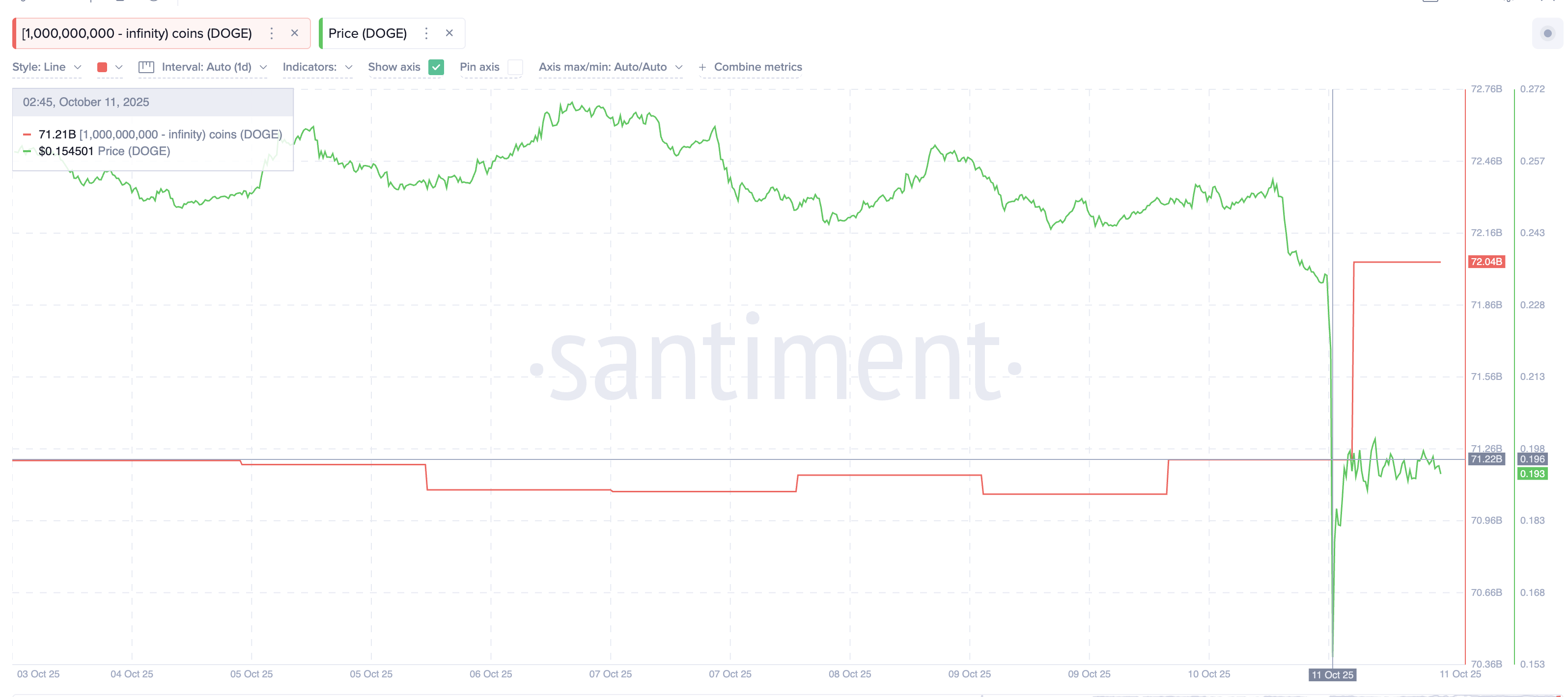Zgodnie z danymi on-chain, portfele posiadające ponad miliard DOGE zwiększyły swoje salda z 71,22 mld do 72,04 mld. Ten ruch dodał do obiegu dodając 0,82 mld DOGE podczas wyprzedaży.