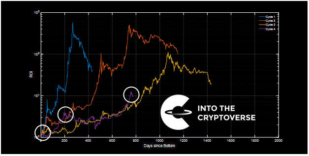 Na przykład, jak dotąd malejące zyski nie mogą być kwestionowane, gdy zmierzymy je od dna bieżącego cyklu rynkowego lub od halvingu. Rozumiem, że 4-ty cykl jest obecnie przed 3-cim cyklem. Jednak w pewnym momencie był też przed 2-gim cyklem, ale ostatecznie nie był w stanie za nim nadążyć. Abyśmy nie doświadczyli malejących zwrotów i wydłużających się cykli, Bitcoin musi osiągnąć około 300 000 dolarów do grudnia 2021 roku. Dane sugerują, że jest to zbyt wysoki cel, chociaż z pewnością nie będę narzekać, jeśli tak się stanie.