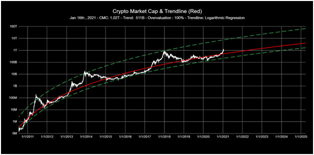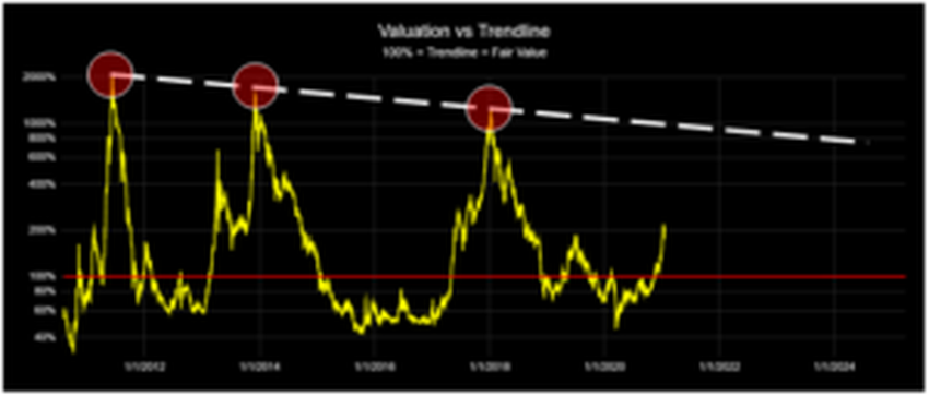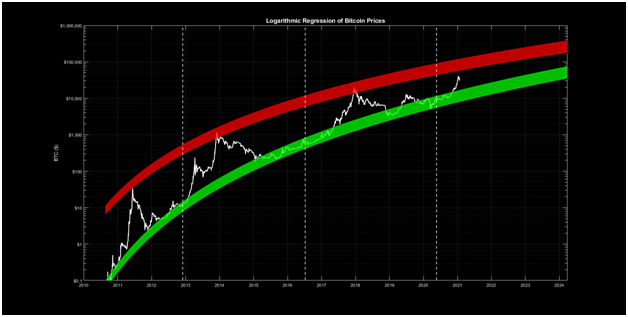 SponsoredBC: Idea polega na tym, że istnieją linie trendu na poziomie makro, które skrywają realną wycenę (fair value) za pomocą właściwie dopasowanej regresji logarytmicznej (czerwona linia poniżej). Wiele linii trendu jest ostatecznie bezużytecznych, ponieważ „trend jest twoim przyjacielem do końca” (‘the trend is your friend until the end’). Myślę jednak, że pojedyncze równanie matematyczne opisujące całą klasę aktywów kryptograficznych jest czymś bardzo poetyckim. A fakt, że ma ono tendencję do tworzenia linii trendu na poziomie makro, która rządzi cyklicznymi szczytami, jest całkiem fajny.