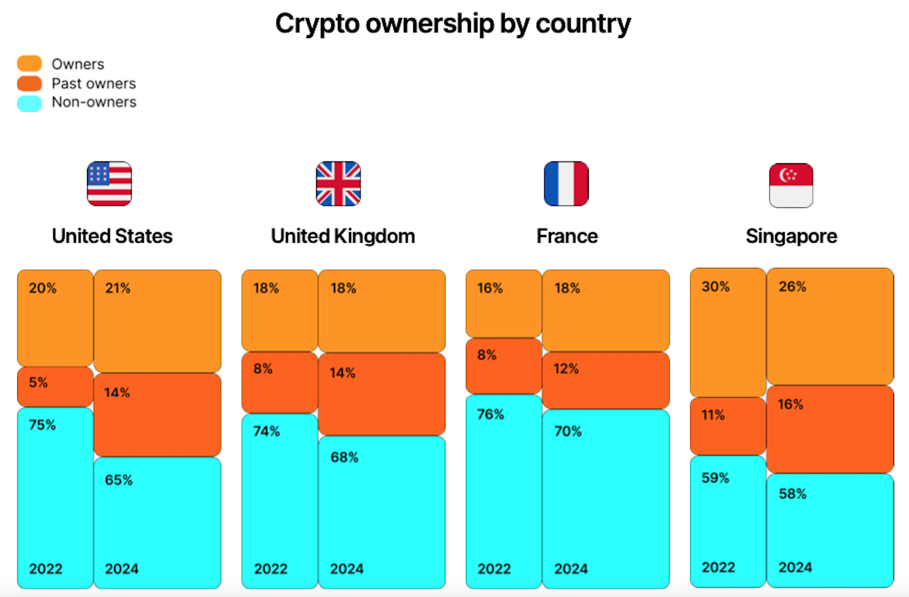 Pomimo tych trudności kryptowaluty zyskują na popularności. Odsetek Amerykanów posiadających cyfrowe aktywa wzrósł z 20% w 2022 roku do 21% w 2024 roku. W tym samym czasie liczba byłych posiadaczy (tzw. past owners) kryptowalut wzrosła z 5% do 14%.