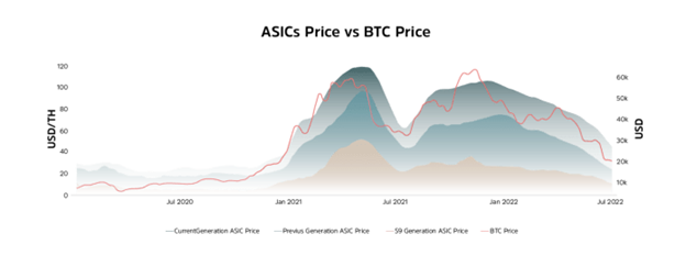 Trochę statystyk: w 2022 roku cena BTC spadła o 47% od kwietnia do sierpnia. Jednocześnie w tym samym okresie koszt sprzętu spadł o 60%. Taką samą korelację odnotowuje Hashrateindex: ASIC traci na wartości szybciej niż spada cena bazowego aktywa.
