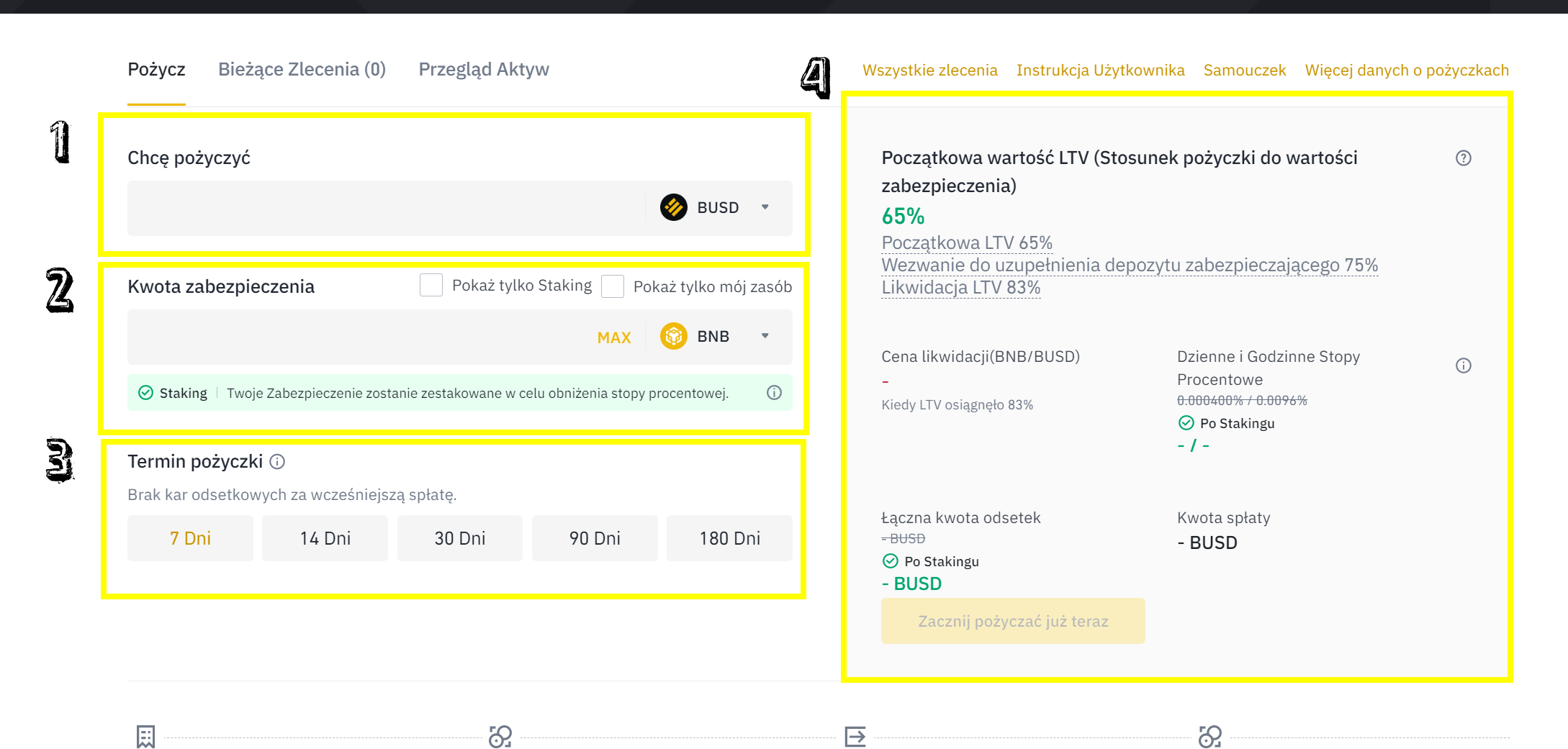 Po prawej stronie wyświetlą Ci się szczegóły dot. twojej pożyczki (4), takie jak stopy procentowe (dziennie, godzinowo), cena likwidacji, LTV, kwota odsetek i kwota do spłaty. Jeżeli wszystko się zgadza kliknij zółty przycisk “Zacznij pożyczać już teraz” i to tyle! Gratulujemy, właśnie zaciągnąłeś swoją pierwszą pożyczkę na Binance!