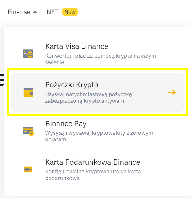 Drugim krokiem jest przejście do strony “Pożyczki Krypto“. Aby to uczynić, wystarczy, że klikniesz w ten link lub najedziesz u góry ekranu na “Finanse”, a następnie “Pożyczki Krypto”.