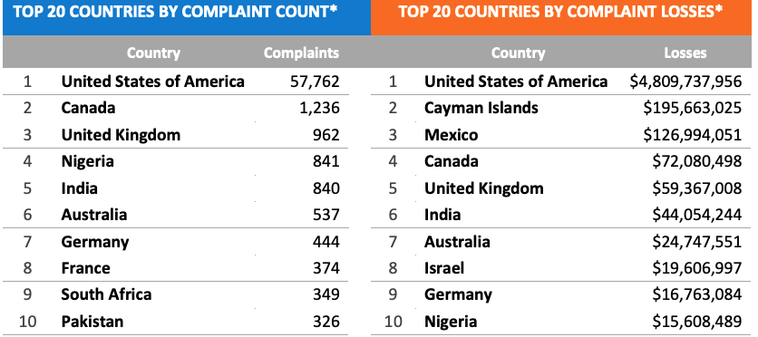 Oszustwa te nie ograniczają się tylko do USA. Zgłoszenia napływały z ponad 200 krajów, ale to Amerykanie stracili najwięcej, bo aż 4,8 mld USD. Na kolejnych miejscach znalazły się Kajmany, Meksyk i Kanada, z dużymi stratami wynoszącymi odpowiednio 196,7 mln USD, 127 mln USD i 77,1 mln USD.