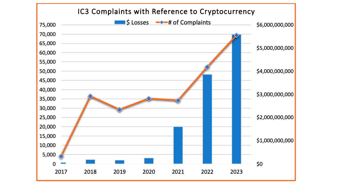 FBI odnotowało coraz więcej przestępstw związanych z kryptowalutami. W 2023 roku Internetowe Centrum Zgłaszania Przestępstw zarejestrowało prawie 70 000 zgłoszeń, z czego 10% dotyczyło właśnie kryptowalut. Wzrost wartości Bitcoina i innych cyfrowych aktywów przyczynił się do większej liczby oszustw.