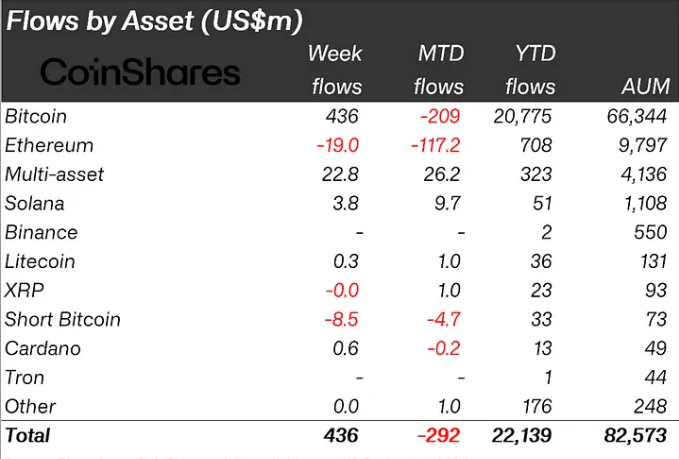 Kryptowaluty odnotowały wzrost inwestycji w wysokości 436 mln USD w zeszłym tygodniu. Stanowi to zmianę koncepcji po serii odpływów sięgających 1,2 mld USD.