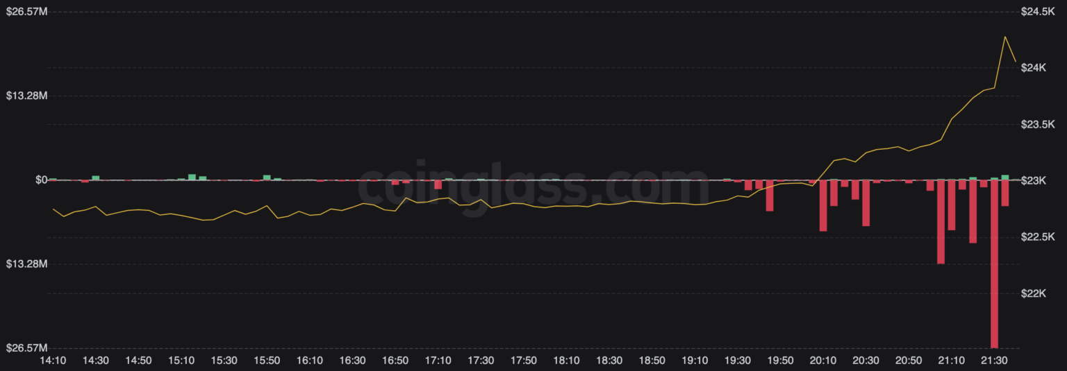 Wzrost rozpoczął się tuż przed godziną 20:00 czasu polskiego. W ciągu ostatnich 24 godzin cena Bitcoina zyskała 9.2%, czyli o prawie 2000 dolarów. Obecnie w obiegu znajduje się 19 291 875 BTC, których wartość rynkowa wynosi 460 miliardów dolarów.